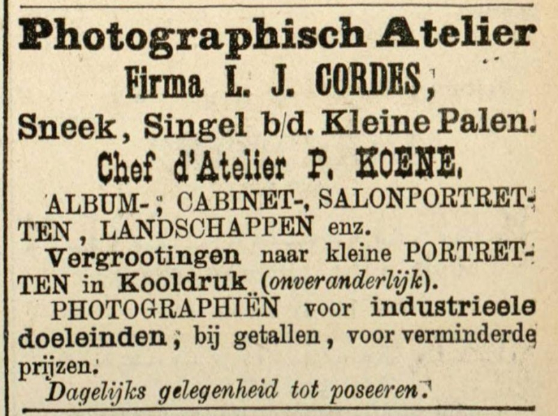 In 1888 vertrekt Louis Johan Cordes, fotograaf sinds 1879 in Sneek, naar Haarlem. Hij draagt zijn zaak over aan Pieter Koene. Koene is fotograaf in Sneek van 1888 tot 1894.