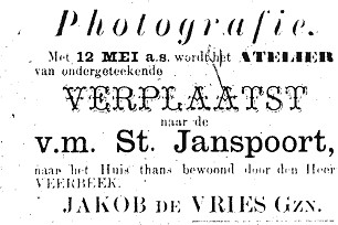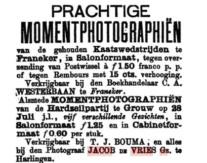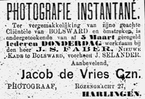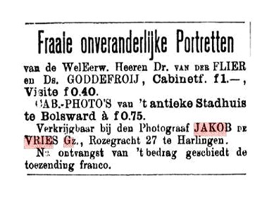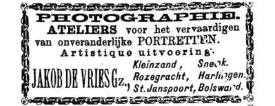 In elk geval had hij een geduchte concurrent gekregen in de persoon van de in 1861 in HarIingen geboren JACOB G. DE VRIES1 die in 1889 een fotoatelier vestigde aan het Grootzand en in 1891 in Sneek kwam wonen. Hij verhuisde zijn atelier later naar het Kleinzand. In de Sneker nieuwsbladen adverteerde hij regelmatig en over zijn werk waren er ook redactionele berichten. [....]
