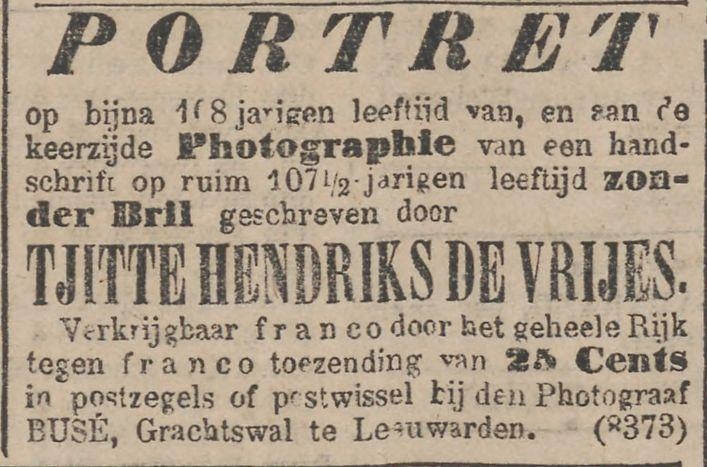 | Bijzonderheden | - | Op de achterkant van deze foto staat: "Beneeden Knijpe de 15 September 1872 Tjitte Hendriks de Vrijes oud 100-7-1/2 […] Eijgenhandig geschreeven met goed seegen en ligt gees[…] een gedagtennisse aan mij. Tjitte Hendriks de Vrijes sonder bril gedaan 1872". (Tjitte Hendriks de Vries is overleden 27 februari 1873, oud 107 jaar in de gemeente Schoterland.) |