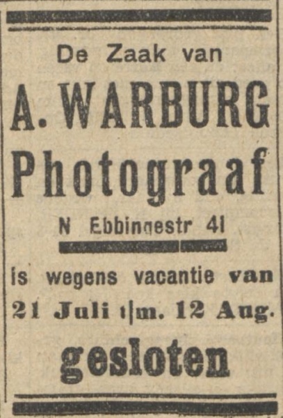 Deze versregels kon men Iezen in de fraaie étalage der Zaterdag door den heer A Warburg geopende winkel in foto-artikelen in het perceel N. Ebbingestraat 41. De nieuwe zaak, de eerste fotohandel in het Noorden der stad, ziet er keurig uit en is met bijzonderen smaak ingericht. De heer Warburg, als fotograaf wel bekend, wil zijn vakkennis ook vooral ten dienste der bij hem koopende amateurs stellen. Als leider van een cursus der Ned. Reisvereeniging heeft hij op dit gebied een goede ervaring opgedaan. Als bijzondere attractie zal de amateur in de étalage iedere week een nieuwe raadgeving of wenk kunnen lezen, die op elkaar aansluiten. zoodat tenslotte de geheele photografie wordt doorgenomen.