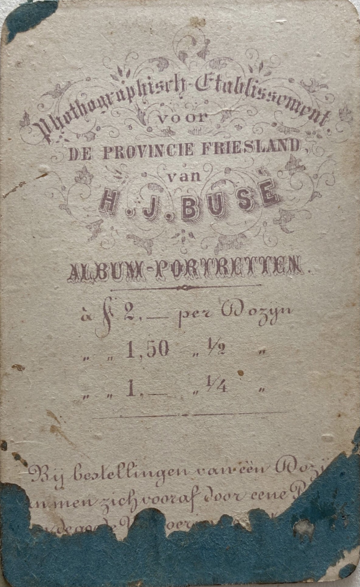 | Bijzonderheden | - | opschrift achterzijde van beide foto's is gelijk: Photographisch Etablissement voor de Provincie Friesland van H.J. Busé |