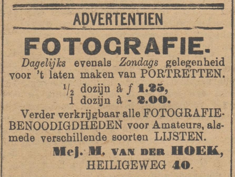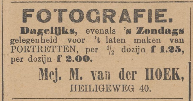 Maria van der Hoek en haar zus Jantina hadden samen een fotografisch atelier op het adres Heiligeweg 40 in Harlingen, hun geboortehuis. Zuster van Melis van der Hoek, fotograaf in Leeuwarden.